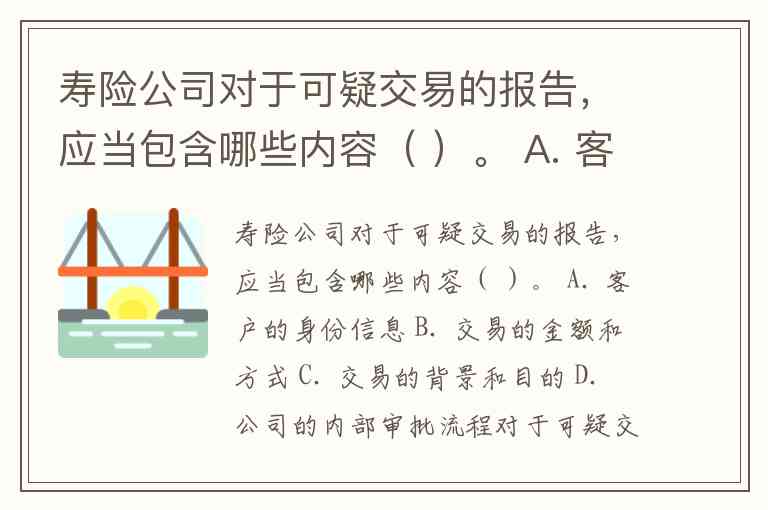 寿险公司对于可疑交易的报告,应当包含哪些内容( )。 A. 客户的身份信息 B. 交易的金额和方式 C. 交易的背景和目的 D. 公司的内部审批流程