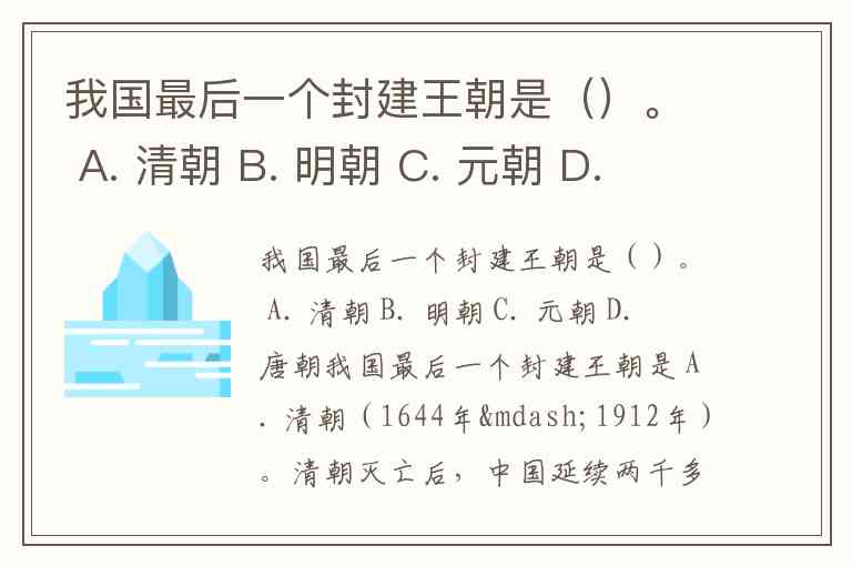 我国最后一个封建王朝是()。 A. 清朝 B. 明朝 C. 元朝 D. 唐朝