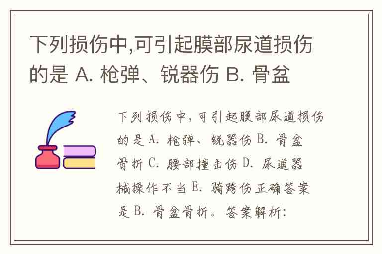 下列损伤中,可引起膜部尿道损伤的是 A. 枪弹、锐器伤 B. 骨盆骨折 C. 腰部撞击伤 D. 尿道器械操作不当 E. 骑跨伤