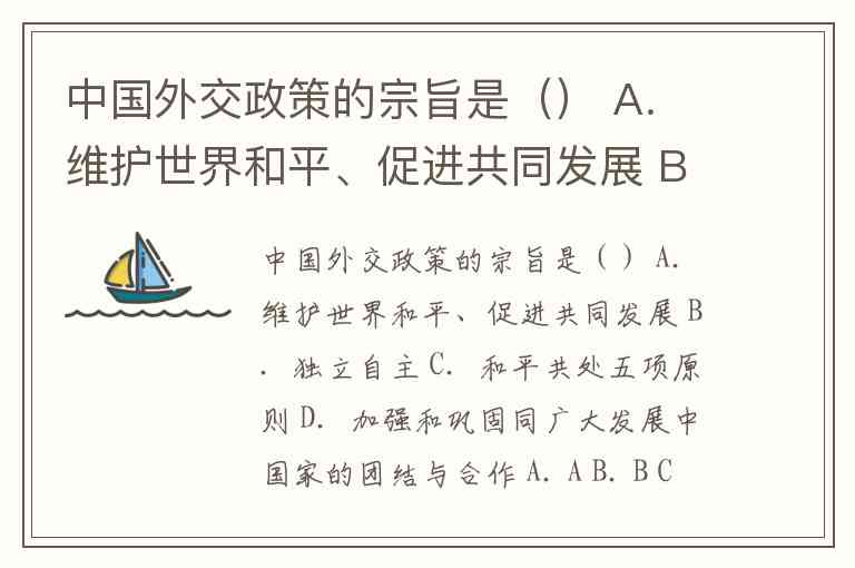 中国外交政策的宗旨是() A.维护世界和平、促进共同发展 B.独立自主 C.和平共处五项原则 D.加强和巩固同广大发展中国家的团结与合作 A. A B. B C. C D. D
