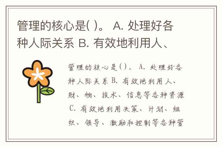 管理的核心是( )。 A. 处理好各种人际关系 B. 有效地利用人、财、物、技术、信息等各种资源 C. 有效地利用决策、计划、组织、领导、激励和控制等各种管理职能 D. 用尽可能少的支出去实现既定的目标