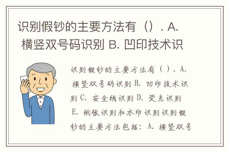 识别假钞的主要方法有(). A. 横竖双号码识别 B. 凹印技术识别 C. 安全线识别 D. 荧光识别 E. 纸张识别和水印识别