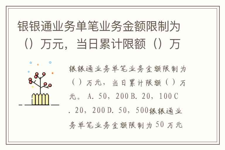 银银通业务单笔业务金额限制为()万元,当日累计限额()万元。 A. 50,200 B. 20,100 C. 20,200 D. 50,500