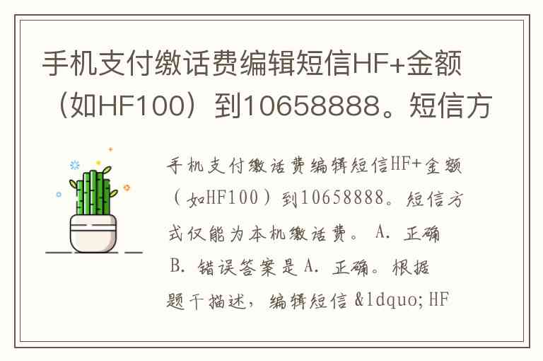 手机支付缴话费编辑短信HF+金额(如HF100)到10658888。短信方式仅能为本机缴话费。 A. 正确 B. 错误