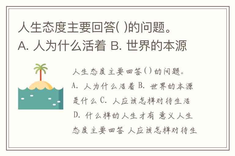 人生态度主要回答( )的问题。 A. 人为什么活着 B. 世界的本源是什么 C. 人应该怎样对待生活 D. 什么样的人生才有 意义