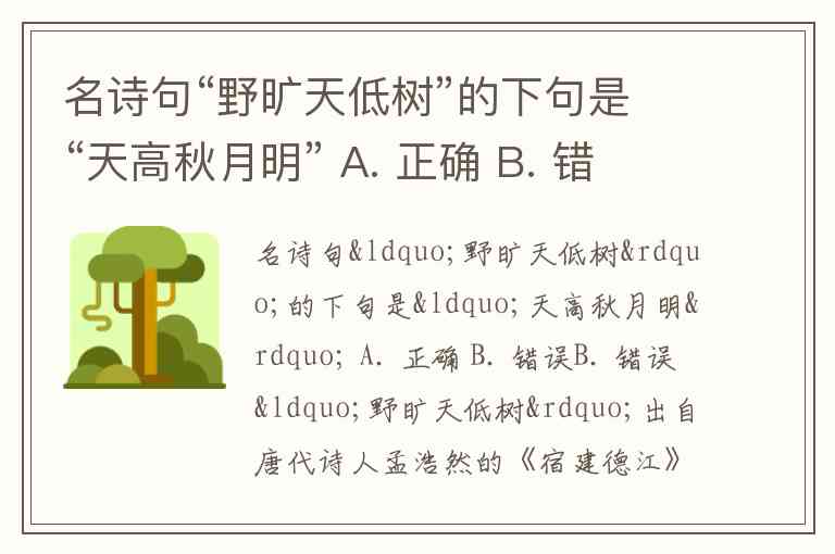 “野旷天低树”出自唐代诗人孟浩然的《宿建德江》,它的下一句是 “江清月近人”,而不是“天高秋月明”。