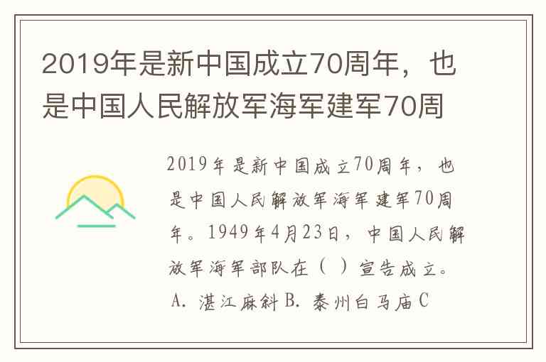 2019年是新中国成立70周年,也是中国人民解放军海军建军70周年。1949年4月23日,中国人民解放军海军部队在( )宣告成立。 A. 湛江麻斜 B. 泰州白马庙 C. 江苏连云港 D. 青岛古镇口
