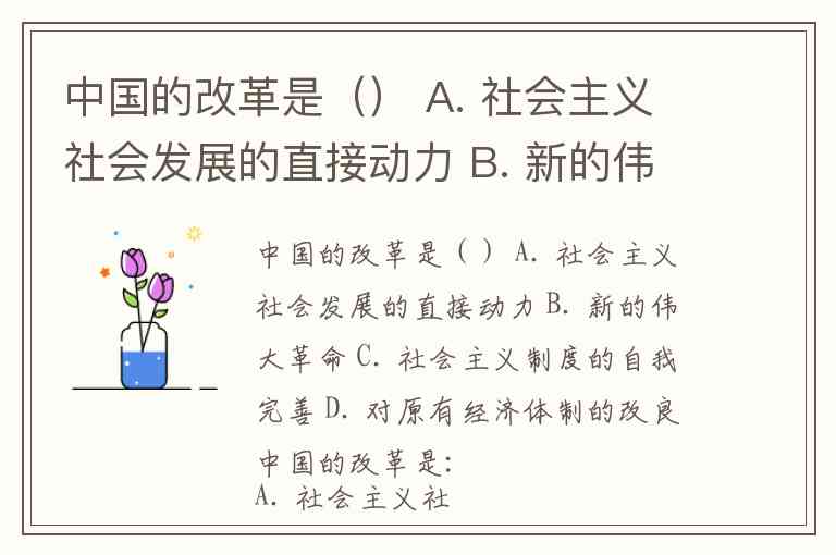 中国的改革是() A. 社会主义社会发展的直接动力 B. 新的伟大革命 C. 社会主义制度的自我完善 D. 对原有经济体制的改良