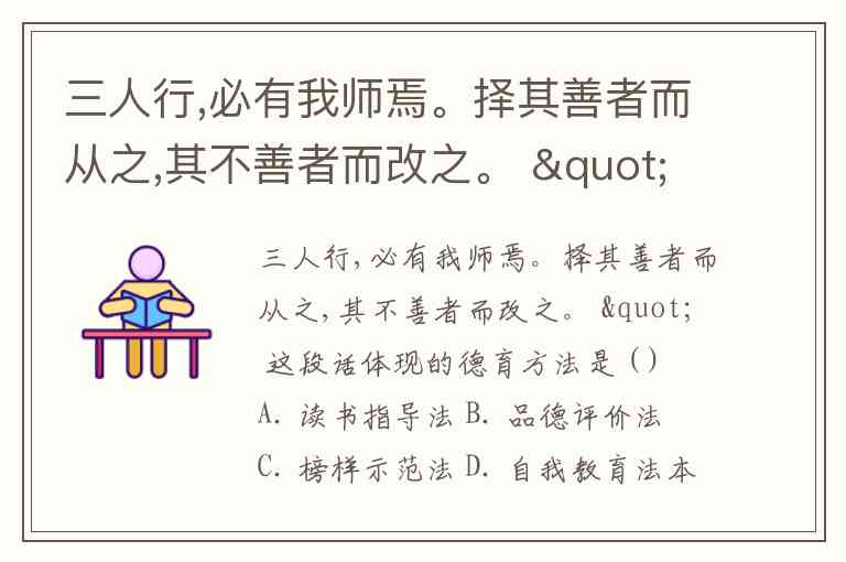 三人行,必有我师焉。择其善者而从之,其不善者而改之。 " 这段话体现的德育方法是 ( ) A. 读书指导法 B. 品德评价法 C. 榜样示范法 D. 自我教育法
