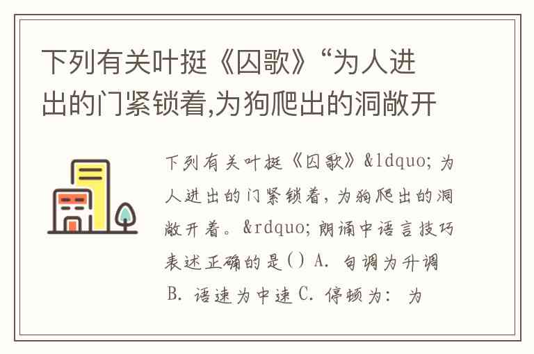 下列有关叶挺《囚歌》“为人进出的门紧锁着,为狗爬出的洞敞开着。”朗诵中语言技巧表述正确的是( ) A. 句调为升调 B. 语速为中速 C. 停顿为:为人进出的门/紧锁着,为狗爬出的洞/敞开着。 D. 重音在“紧锁”和“敞开”