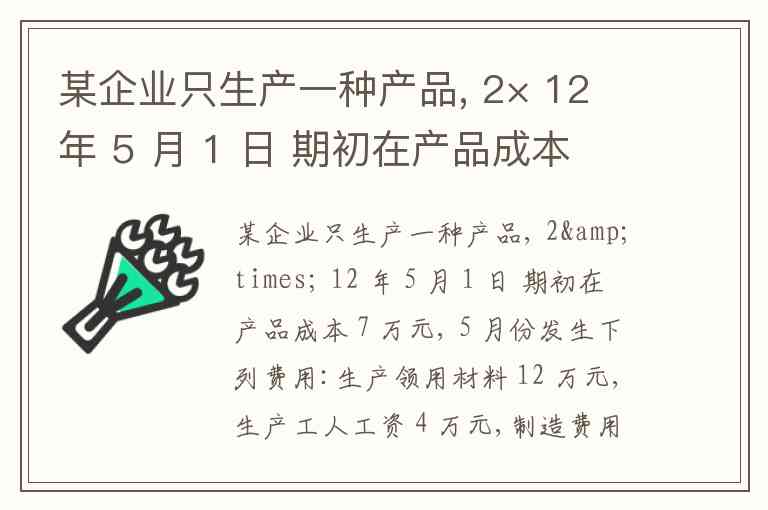 某企业只生产一种产品, 2× 12 年 5 月 1 日 期初在产品成本 7 万元, 5 月份发生下列费用:生产领用材料 12 万元,生产工人工资 4 万元,制造费用 2 万元,管理费用 3 万元,广告费用 1.6 万元,月末在产品成本 6 万元。该企业 5 月份完工产品的生产成本为( )。 A. 16.6万元 B. 18万元 C. 19万元 D. 23.6万元