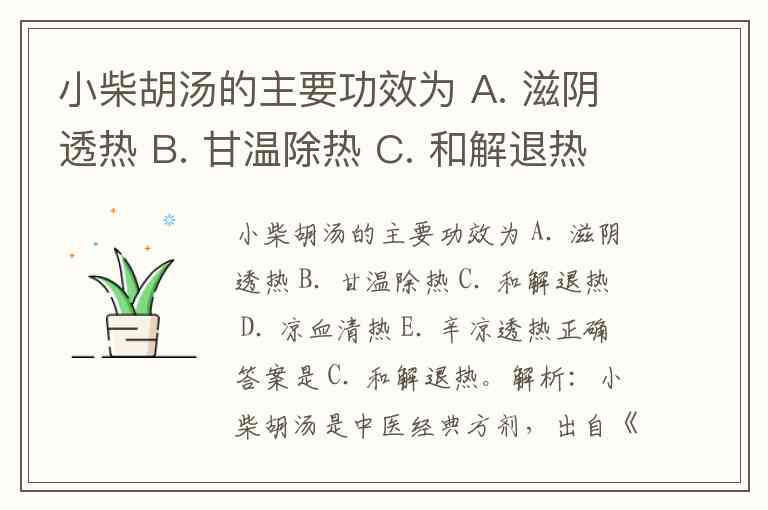 小柴胡汤的主要功效为 A. 滋阴透热 B. 甘温除热 C. 和解退热 D. 凉血清热 E. 辛凉透热
