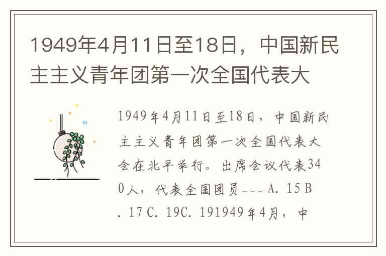 1949年4月11日至18日,中国新民主主义青年团第一次全国代表大会在北平举行。出席会议代表340人,代表全国团员___ A. 15 B. 17 C. 19