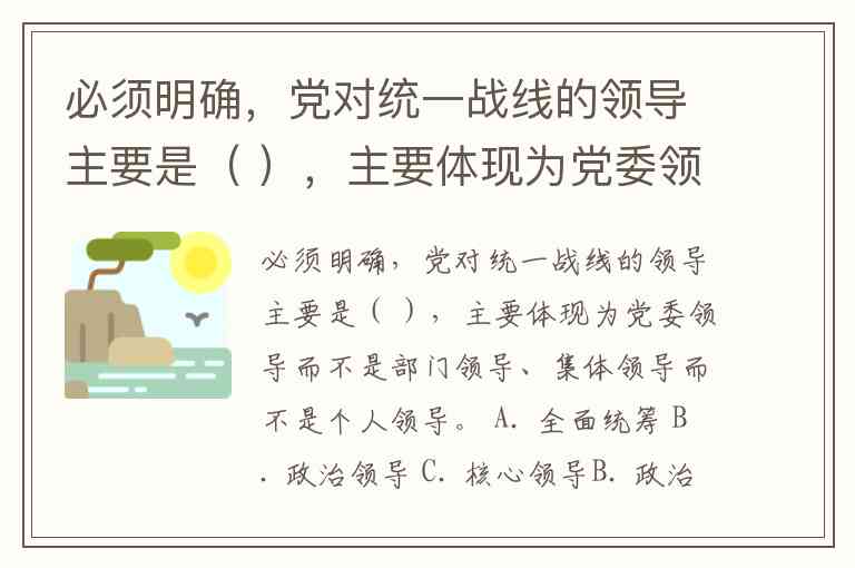 必须明确,党对统一战线的领导主要是( ),主要体现为党委领导而不是部门领导、集体领导而不是个人领导。 A. 全面统筹 B. 政治领导 C. 核心领导