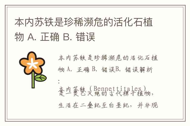 解析:本内苏铁(Bennettitales)是一类已灭绝的古代裸子植物,生活在二叠纪至白垩纪,并非现代仍存在的“活化石植物”。因此,说它是“珍稀濒危的活化石植物”是不正确的。