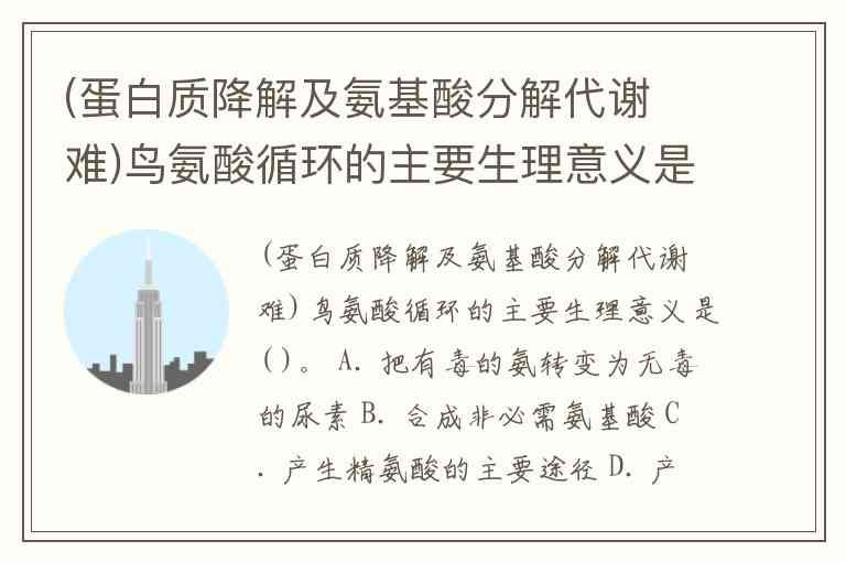 (蛋白质降解及氨基酸分解代谢 难)鸟氨酸循环的主要生理意义是( )。 A. 把有毒的氨转变为无毒的尿素 B. 合成非必需氨基酸 C. 产生精氨酸的主要途径 D. 产生鸟氨酸的主要途径