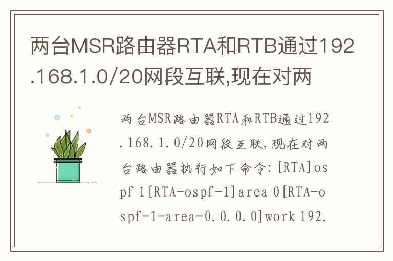 两台MSR路由器RTA和RTB通过192.168.1.0/20网段互联,现在对两台路由器执行如下命令:[RTA]ospf 1[RTA-ospf-1]area 0[RTA-ospf-1-area-0.0.0.0]work 192.168.1.0 0.0.0.255[RTB]ospf 100[RTB-ospf-100]area 1[RTB-ospf-100-area-0.0.0.1]work 192.168.1.0 0.0.0.255从以上配置可以判断。 A. RTA和RTB可以建立OSPF邻居关系 B. RTA和RTB不可以建立OSPF邻居关系,假设将area ID配置成一致,就可以建立OSPF邻居关系 C. RTA和RTB不可以建立OSPF邻居关系,假设将OSPF进程号配置成一致,就可以建立OSPF邻居关系 D. RTA和RTB不可以建立OSPF邻居关系,必须将OSPF进程号和area ID都配置成一致,才可以建立OSPF邻居关系