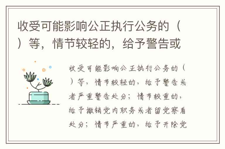 根据《中国共产党纪律处分条例》的规定,收受可能影响公正执行公务的 礼品、礼金、消费卡和有价证券、股权、其他金融产品等财物,情节较轻的,给予警告或者严重警告处分;情节较重的,给予撤销党内职务或者留党察看处分;情节严重的,给予开除党籍处分。