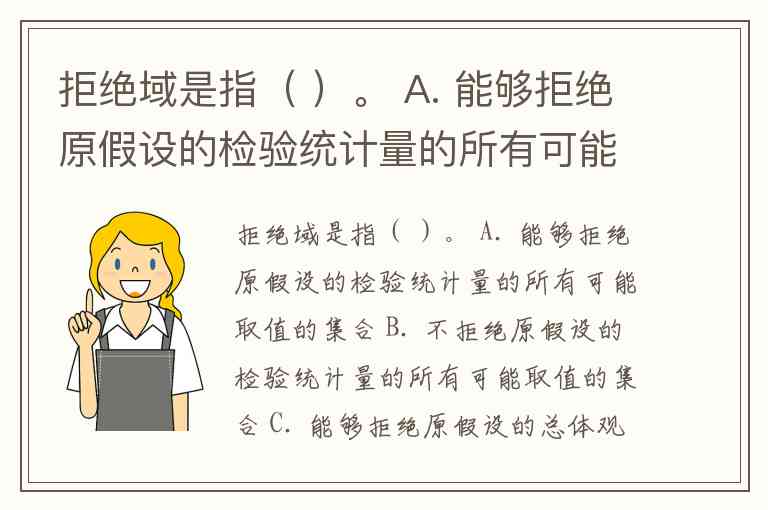 拒绝域是指( )。 A. 能够拒绝原假设的检验统计量的所有可能取值的集合 B. 不拒绝原假设的检验统计量的所有可能取值的集合 C. 能够拒绝原假设的总体观测值的和 D. 能够拒绝原假设的样本观测值的和