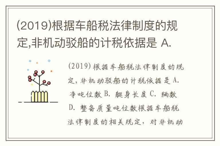 (2019)根据车船税法律制度的规定,非机动驳船的计税依据是 A. 净吨位数 B. 艇身长度 C. 辆数 D. 整备质量吨位数