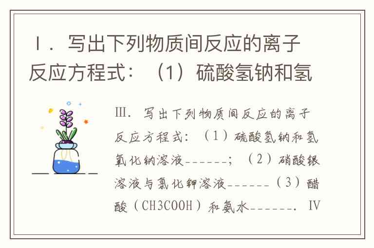 Ⅰ.写出下列物质间反应的离子反应方程式:(1)硫酸氢钠和氢氧化钠溶液______;(2)硝酸银溶液与氯化钾溶液______(3)醋酸(CH3COOH)和氨水______.Ⅱ.根据反应方程式回答下列问题:(1)标明该反应电子转移的方向和数目:8NH3 +3Cl2 =6NH4Cl+N2______(2)氧化剂是______,被氧化的元素是______,还原剂与还原产物的质量比是______.
