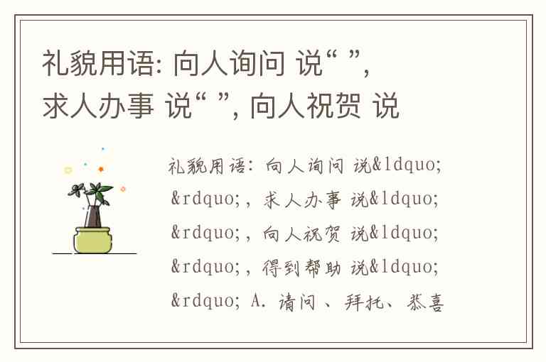 礼貌用语: 向人询问 说“ ”, 求人办事 说“ ”, 向人祝贺 说“ ”, 得到帮助 说“ ” A. 请问 、拜托、恭喜、不用谢 B. 喂、拜托、恭喜、谢谢 C. 请问 、拜托、恭喜、谢谢 D. 请问 、拜托、、还行、谢谢