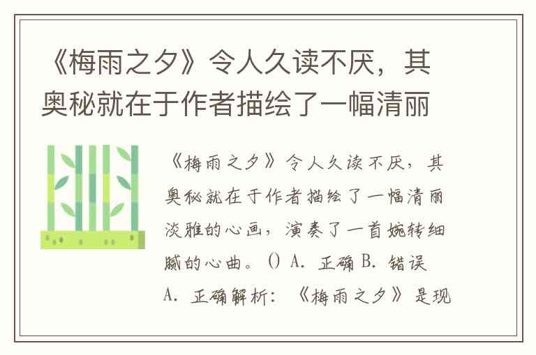 《梅雨之夕》令人久读不厌,其奥秘就在于作者描绘了一幅清丽淡雅的心画,演奏了一首婉转细腻的心曲。() A. 正确 B. 错误