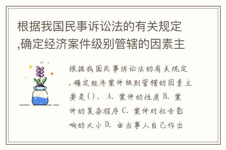 根据我国民事诉讼法的有关规定,确定经济案件级别管辖的因素主要是( )。 A. 案件的性质 B. 案件的复杂程序 C. 案件对社会影响的大小 D. 由当事人自己作出决定