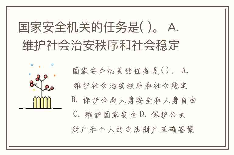 国家安全机关的任务是( )。 A. 维护社会治安秩序和社会稳定 B. 保护公民人身安全和人身自由 C. 维护国家安全 D. 保护公共财产和个人的合法财产