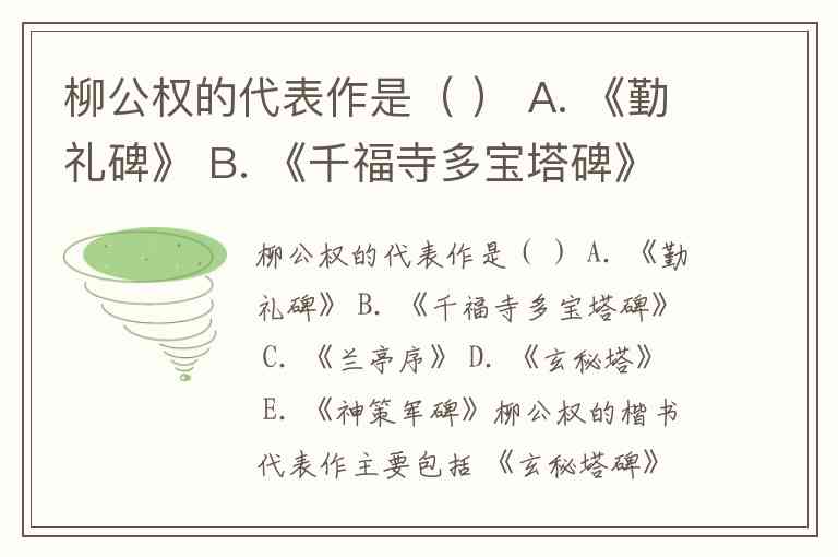 柳公权的代表作是( ) A. 《勤礼碑》 B. 《千福寺多宝塔碑》 C. 《兰亭序》 D. 《玄秘塔》 E. 《神策军碑》