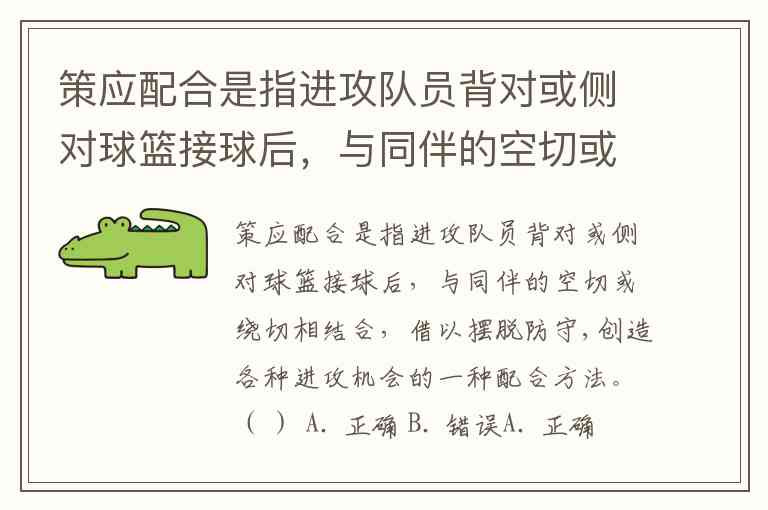 策应配合是指进攻队员背对或侧对球篮接球后,与同伴的空切或绕切相结合,借以摆脱防守,创造各种进攻机会的一种配合方法。( ) A. 正确 B. 错误
