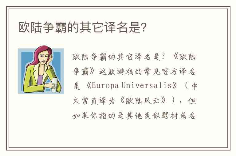 《欧陆争霸》这款游戏的常见官方译名是 《Europa Universalis》(中文常直译为《欧陆风云》),但如果你指的是其他类似题材或名称的游戏,可能还有以下情况: