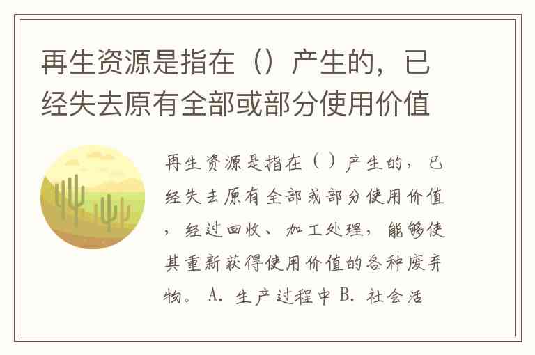 再生资源是指在()产生的,已经失去原有全部或部分使用价值,经过回收、加工处理,能够使其重新获得使用价值的各种废弃物。 A. 生产过程中 B. 社会活动过程中 C. 社会生产和生活消费过程中 D. 城镇生产过程中