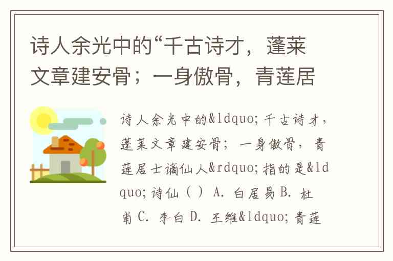 诗人余光中的“千古诗才,蓬莱文章建安骨;一身傲骨,青莲居士谪仙人”指的是“诗仙() A. 白居易 B. 杜甫 C. 李白 D. 王维