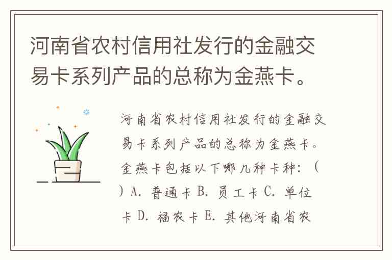 河南省农村信用社发行的金融交易卡系列产品的总称为金燕卡。金燕卡包括以下哪几种卡种:( ) A. 普通卡 B. 员工卡 C. 单位卡 D. 福农卡 E. 其他