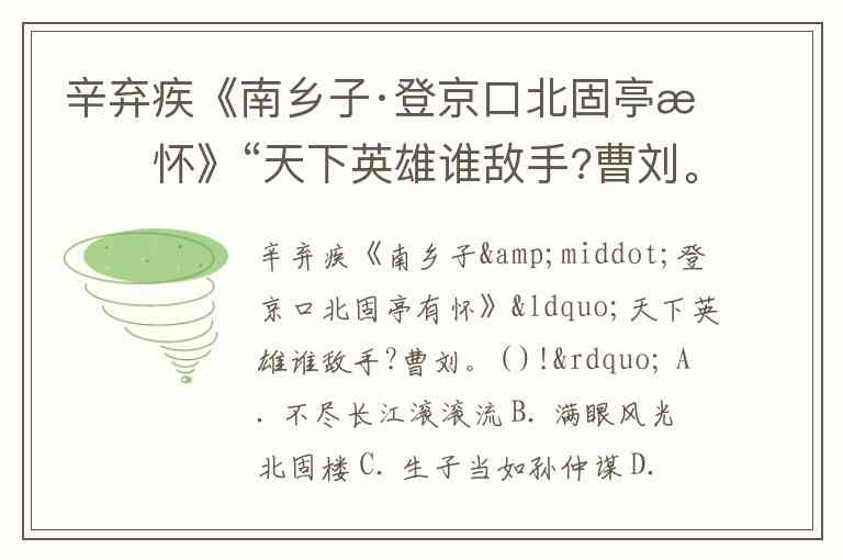 辛弃疾《南乡子·登京口北固亭有怀》“天下英雄谁敌手?曹刘。( )!” A. 不尽长江滚滚流 B. 满眼风光北固楼 C. 生子当如孙仲谋 D. 却道“天凉好个秋”