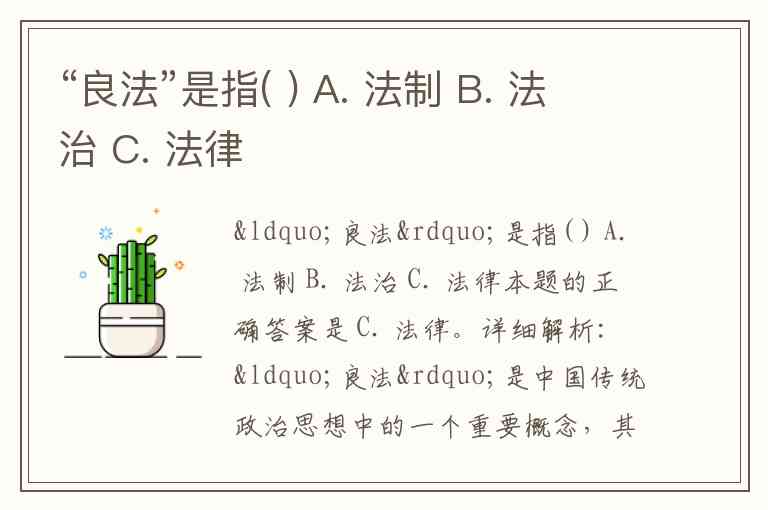 “良法”是中国传统政治思想中的一个重要概念,其直接对应的就是优良的、善好的法律。它强调的是法律本身的内容和价值取向,即法律应当是制定良好、合乎正义、能够保障民众福祉的规范。