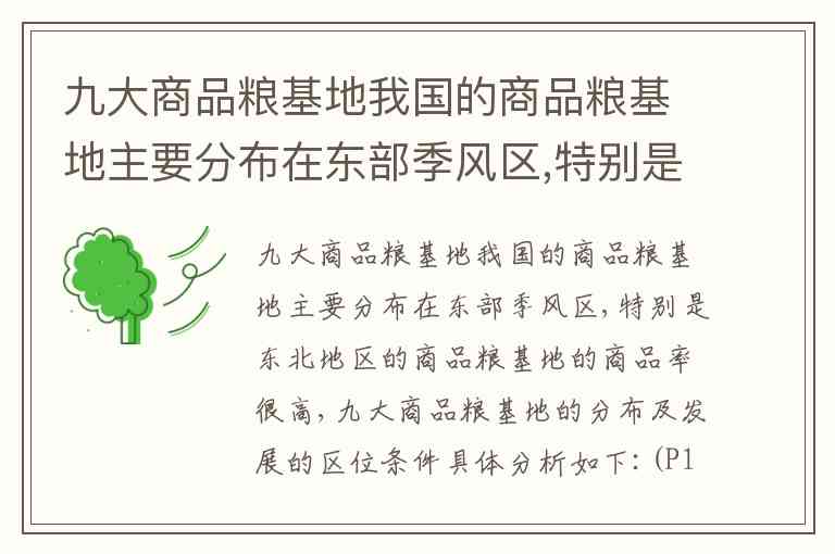 九大商品粮基地我国的商品粮基地主要分布在东部季风区,特别是东北地区的商品粮基地的商品率很高,九大商品粮基地的分布及发展的区位条件具体分析如下:(P192)商品粮基地优势劣势例1: 读我国农业生产潜力分布简图,回答(1)~(3)题。(1)影响图中不同地区农业生产潜力的主要区位因素是( ) A. 地形 B. 气候 C. 市场 D. 交通