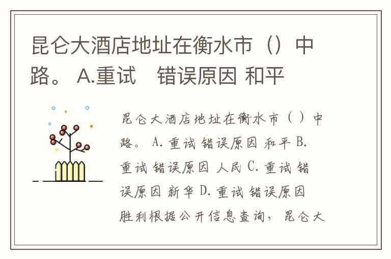 昆仑大酒店地址在衡水市()中路。 A.重试 错误原因 和平 B.重试 错误原因 人民 C.重试 错误原因 新华 D.重试 错误原因 胜利