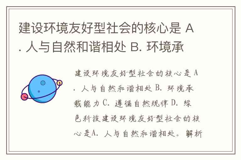 建设环境友好型社会的核心是 A. 人与自然和谐相处 B. 环境承载能力 C. 遵循自然规律 D. 绿色科技