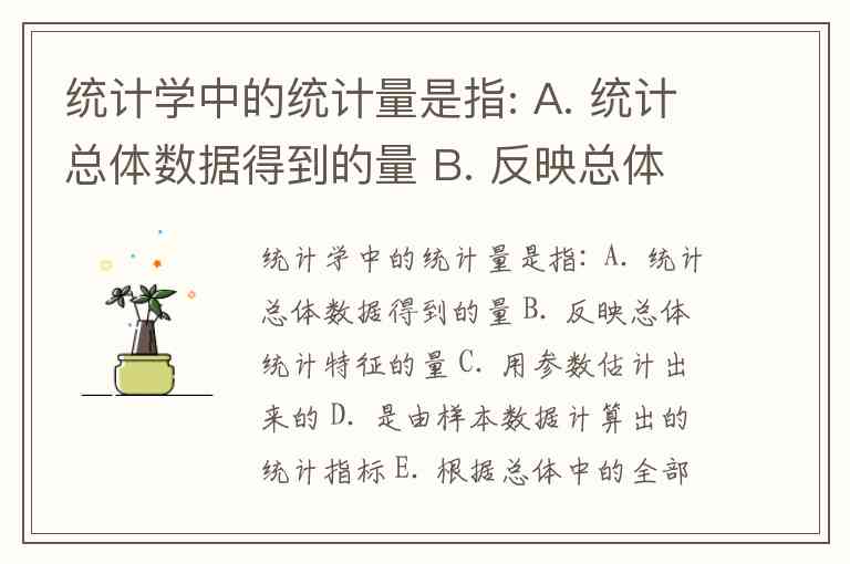 统计学中的统计量是指: A. 统计总体数据得到的量 B. 反映总体统计特征的量 C. 用参数估计出来的 D. 是由样本数据计算出的统计指标 E. 根据总体中的全部数据计算出的统计指标