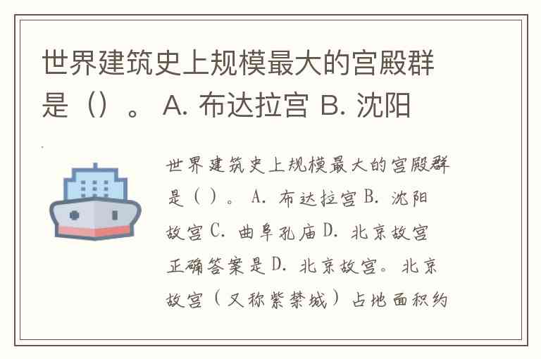 世界建筑史上规模最大的宫殿群是()。 A. 布达拉宫 B. 沈阳故宫 C. 曲阜孔庙 D. 北京故宫