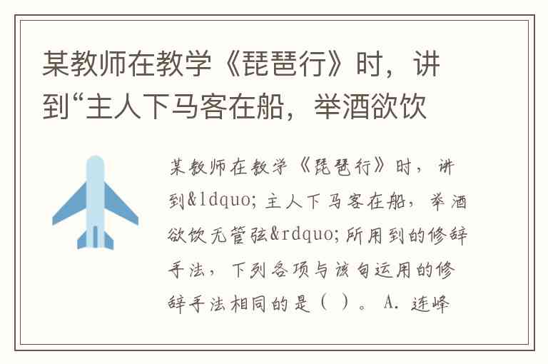 某教师在教学《琵琶行》时,讲到“主人下马客在船,举酒欲饮无管弦”所用到的修辞手法,下列各项与该句运用的修辞手法相同的是( )。 A. 连峰去天不盈尺,枯松倒挂倚绝壁。 B. 烟笼寒水月笼沙,夜泊秦淮近酒家。 C. 忽闻水上琵琶声,主人忘归客不发。 D. 嘈嘈切切错杂弹,大珠小珠落玉盘。