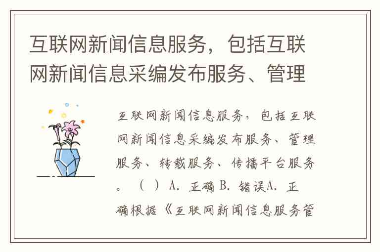 互联网新闻信息服务,包括互联网新闻信息采编发布服务、管理服务、转载服务、传播平台服务。 ( ) A. 正确 B. 错误
