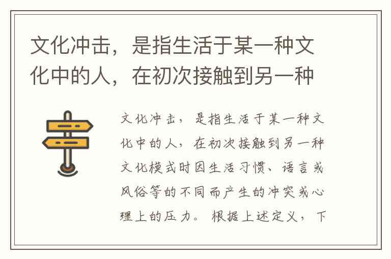 定义:文化冲击是“生活于某一种文化中的人,在初次接触到另一种文化模式时因生活习惯、语言或风俗等的不同而产生的冲突或心理上的压力”。