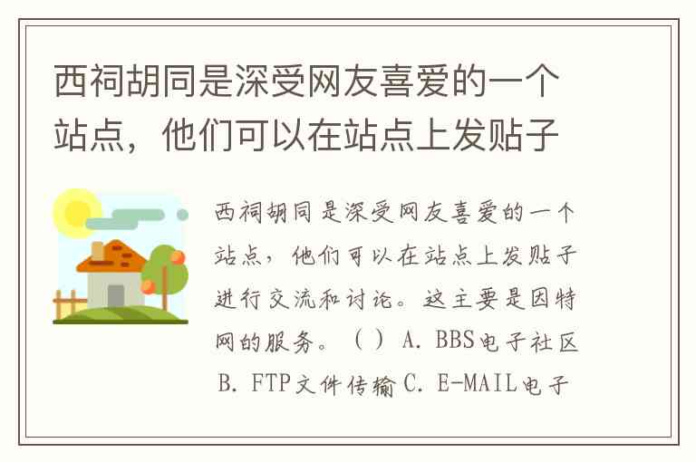 西祠胡同是深受网友喜爱的一个站点,他们可以在站点上发贴子进行交流和讨论。这主要是因特网的服务。() A. BBS电子社区 B. FTP文件传输 C. E-MAIL电子邮件 D. WWW信息浏览