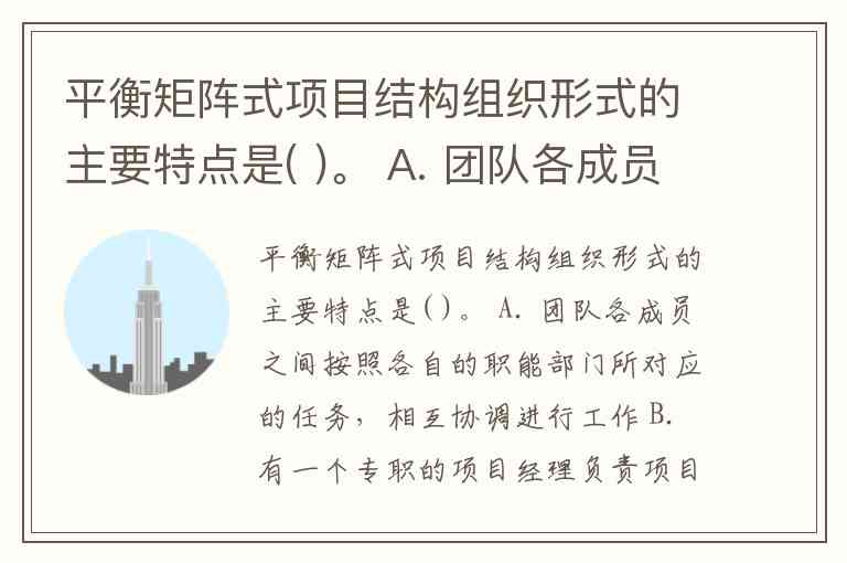 平衡矩阵式项目结构组织形式的主要特点是( )。 A. 团队各成员之间按照各自的职能部门所对应的任务,相互协调进行工作 B. 有一个专职的项目经理负责项目的管理与运行于作,项目经理往往来自于公司的专门项目管理部门 C. 由一职能部门,”的团队成员担任,其工作除项目的管理工作外,还可能负责本部门承担的相应的项目中的任务 D. 方式灵活,公司可根据具体项目与公司的情况确定项目管理的组织形式,而不受现有模式的限制