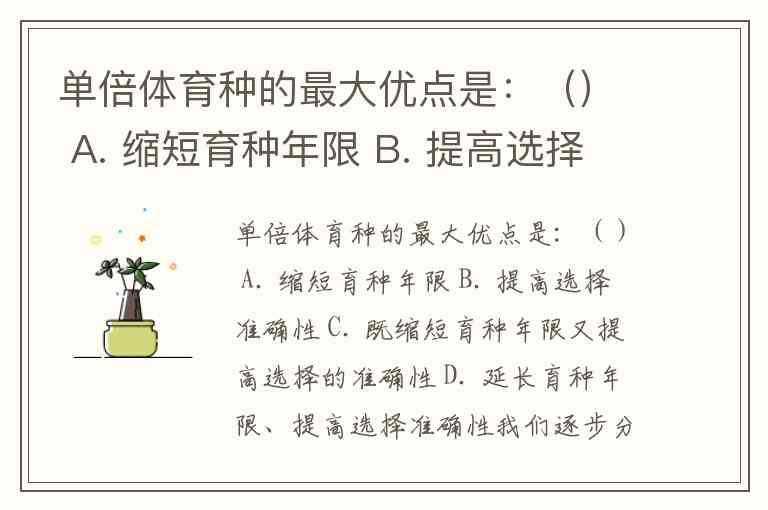 单倍体育种的最大优点是:() A. 缩短育种年限 B. 提高选择准确性 C. 既缩短育种年限又提高选择的准确性 D. 延长育种年限、提高选择准确性