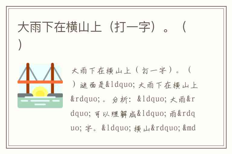 分析:“大雨”可以理解成“雨”字。“横山”—— “山” 横过来就是“彐”(雪的下面部分),或者把“横”理解为“一横”,于是“横山”可以看作“山”被一横压着,即“雪”的下半部分是“彐”,但这里是“横山”,更常见解法是“横着的山”就是“彐”。