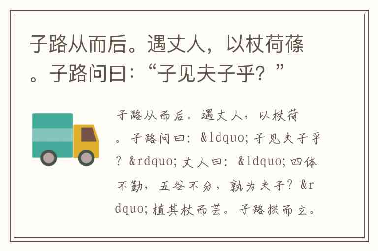 子路从而后。遇丈人,以杖荷蓧。子路问曰:“子见夫子乎?”丈人曰:“四体不勤,五谷不分,孰为夫子?”植其杖而芸。子路拱而立。止子路宿,杀鸡为黍而食之,见其二子焉。 明日,子路行,以告。子曰:“隐者也。”使子路反见之。至则行矣。子路曰:“不仕无义。长幼之节,不可废也,君臣之义,如之何其废之?欲洁其身,而乱大伦。君子之仕也,行其义也。道之不行,已知之矣。”“见其二子焉”中的“见”是()。 A. 使动用法,“使„„拜见”的意思 B. 使动用法,“使„„出现”的意思 C. 动词谓语,“看见”的意思 D. 动词谓语,“拜见”的意思